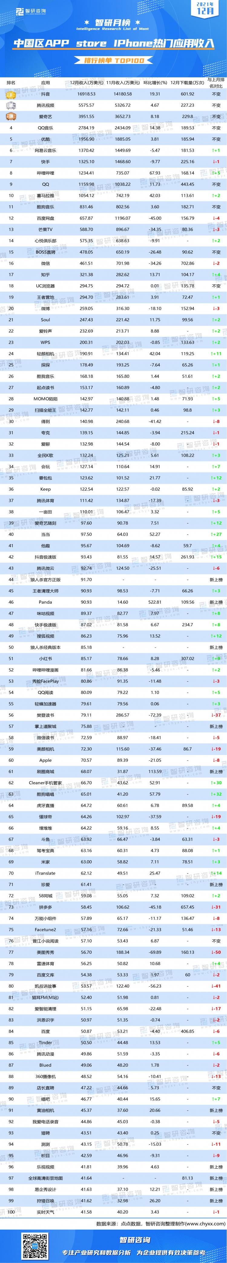 12月中國區APP store iPhone熱門收入前100的應用共計收入4.891億美元;與上月熱門收入前100相比,狼人殺官方正版、Panda等11個應用新上榜,其中狼人殺官方正版收入最高,為91.7萬美元;12個應用收入排名不變,其中包括排名前5的抖音、騰訊視頻、網易云音樂、嗶哩嗶哩、喜馬拉雅等43個應用收入排名上升,酷狗唱唱排名上升最多,提高了32個名次;快手、百度網盤、芒果TV、微信和微博等34個應用收入排名下降,美圖秀秀降幅最大,下降50名次跌至第77。