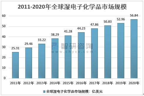 智研咨詢發布的《2021-2027年中國濕電子化學品行業市場運營態勢及投資潛力研究報告》顯示:全球濕電子化學品市場,歐美、日本企業的份額逐年下降,中國等國家、地區的市場份額穩步提升。根據計算數據,2019年全球濕電子化學品市場規模為52.96億美元,其中半導體、平板顯示器和太陽能電池是濕電子化學品的三大應用市場。2020年全球濕電子化學品市場規模增長至56.84億美元,增幅7.33%。