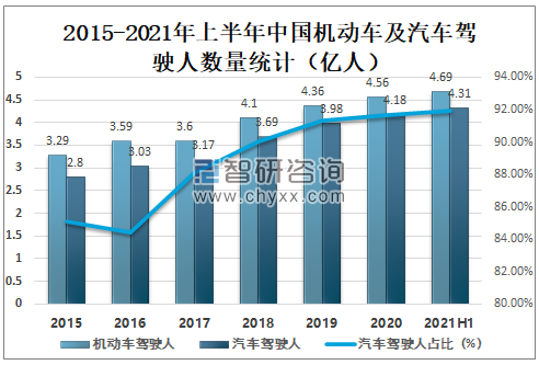 自2016年起中國機(jī)動(dòng)車駕駛?cè)藬?shù)量逐年增加,2021年上半年中國機(jī)動(dòng)車駕駛?cè)藬?shù)量達(dá)4.69億人,其中汽車駕駛?cè)诉_(dá)4.31億人,占機(jī)動(dòng)車駕駛?cè)丝倲?shù)的91.90%,占比非常大。