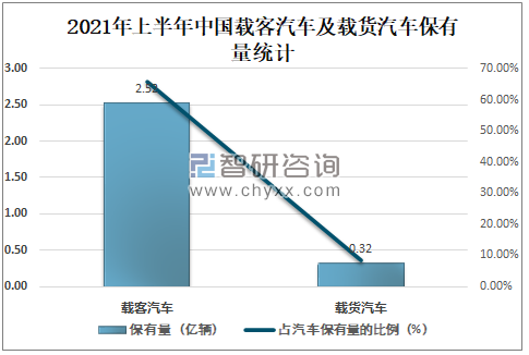 智研咨詢發(fā)布的《2021-2027年中國汽車行業(yè)競(jìng)爭(zhēng)格局分析及投資前景規(guī)劃報(bào)告》數(shù)據(jù)顯示:2021年上半年中國載客汽車保有量為2.52億輛,占汽車保有量的65.63%,占比非常大;載貨汽車保有量為0.32億輛,占汽車保有量的8.31%。