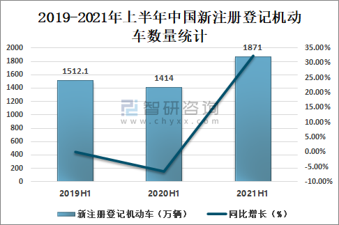 2021年上半年,全國新注冊(cè)登記機(jī)動(dòng)車1871萬輛,與去年同期相比增加457萬輛,增長32.33%;與2019年上半年相比增加358.9萬輛,增長23.74%,創(chuàng)同期歷史新高。
