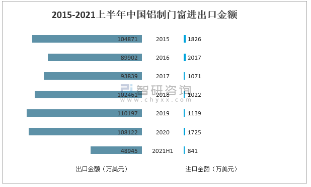 2015-2021上半年中國(guó)鋁制門(mén)窗進(jìn)出口金額