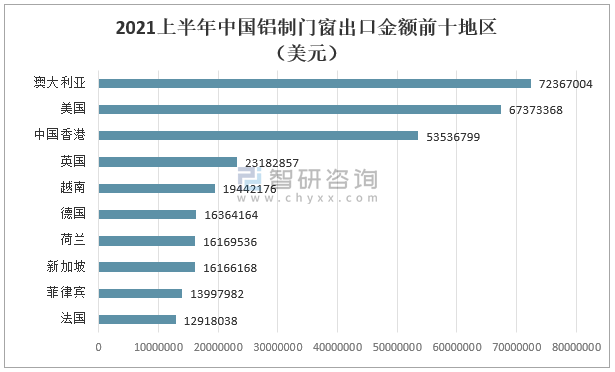 2021上半年中國(guó)鋁制門(mén)窗出口金額前十地區(qū)