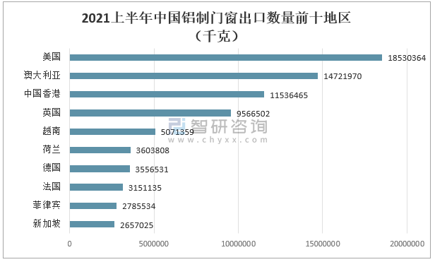 其中2021上半年中國(guó)鋁制門(mén)窗出口數(shù)量最多地區(qū)為美國(guó)18530364千克;其次是出口至澳大利亞地區(qū)鋁制門(mén)窗數(shù)量14721970千克。