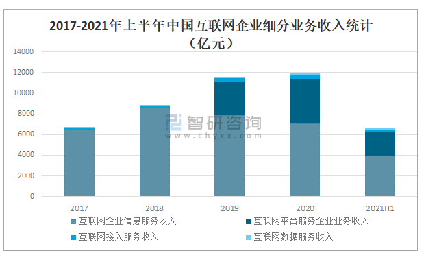 2017-2021年上半年中國互聯網企業細分業務收入統計(億元)