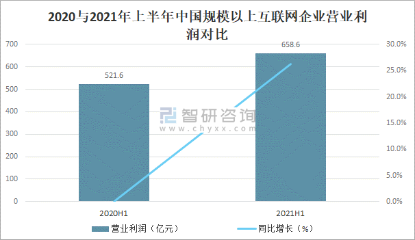 隨著中國規模以上互聯網企業業務收入的增加,營業利潤也隨之增長,2020年中國規模以上互聯網企業營業利潤達1187億元,較2019年增加了163億元,同比增長15.9%,2021年上半年中國規模以上互聯網企業營業利潤已完成658.6億元。