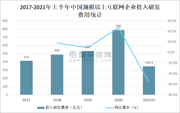 在研發費用方面,近年來互聯網企業投入研發費用逐年增加,2020年中國規模以上互聯網企業投入研發費用達788億元,較2019年增加了253億元,同比增長47.29%,2021年上半年中國規模以上互聯網企業投入研發費用為346.3億元。