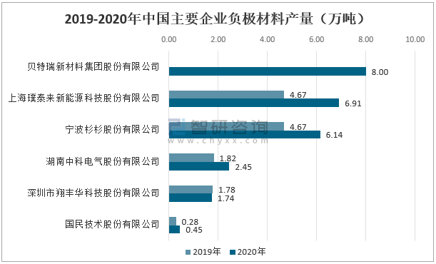 2019-2020年中國(guó)主要企業(yè)負(fù)極材料產(chǎn)量(萬(wàn)噸)