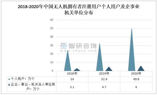 2018-2020年中國無人機擁有者注冊用戶個人用戶及企事業機關單位分布