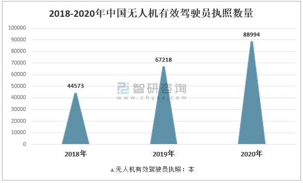 2018-2020年中國無人機有效駕駛員執照高速增長,2019年中國無人機有效駕駛員執照67218本,較2018年增長22645本,同比增長50.8%;2020年中國無人機有效駕駛員執照88994本,較2019年增長21776本,同比增長32.4%。