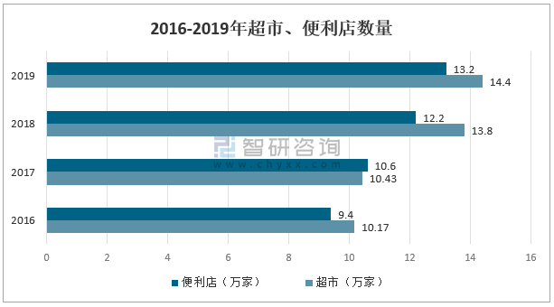 2016-2019年超市、便利店數量