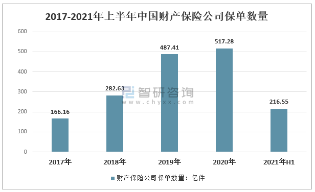 2017-2020年中國財產保險公司保單數量呈增長趨勢,截止2020年底,中國財產保險公司保單數量517.28億件,較2019年增長29.87億件;2021年上半年中國財產保險公司保單數量216.55億件。