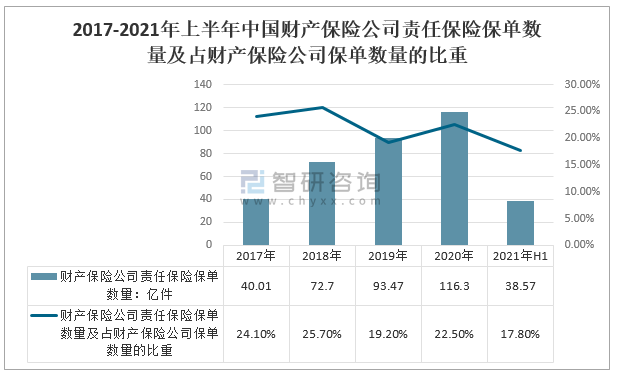 2020年中國財產保險公司責任保險保單數量116.3億件,占財產保險公司保單數量的22.5%;2021年上半年財產保險公司責任保險保單數量38.57億件,占財產保險公司保單數量的17.8%。