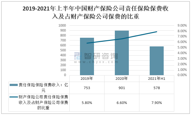 責任保險作為一種保險形式發展較晚,19世紀后半葉開始隨著近代社會為保障災害事故受害人利益而確立。是指以保險客戶的法律賠償風險為承保對象的一類保險,它屬于廣義財產保險范疇。近年來,中國財產保險公司責任保險保費收入及占財產保險公司保費的比重逐年增長,2021年上半年,中國財產保險公司責任保險保費收入及占財產保險公司保費的7.9%,較2020年全年財產保險公司責任保險保費收入及占財產保險公司保費的6.6%增長1.3個百分點。