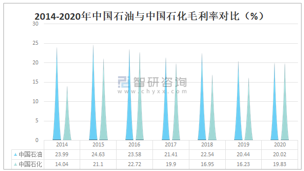 2014-2020年中國石油與中國石化毛利率對比(%)