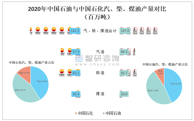 2020年中國石油與中國石化汽、柴、煤油產量對比(百萬噸)