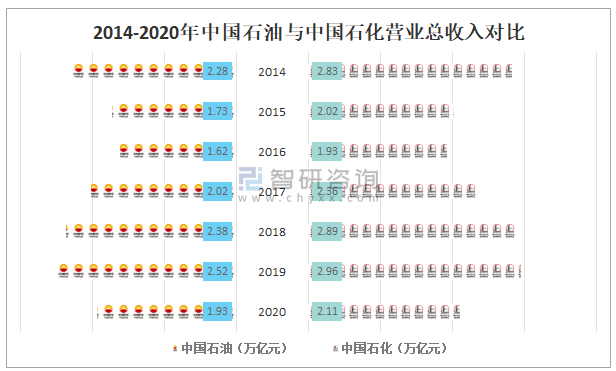 2014-2020年中國石油與中國石化營業總收入對比