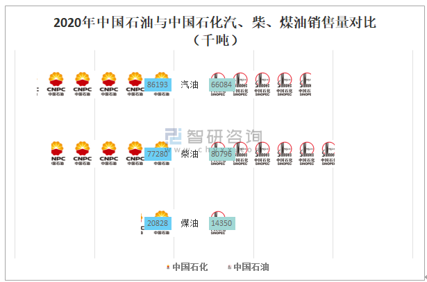 2020年中國石油與中國石化汽、柴、煤油銷售量對比(千噸)