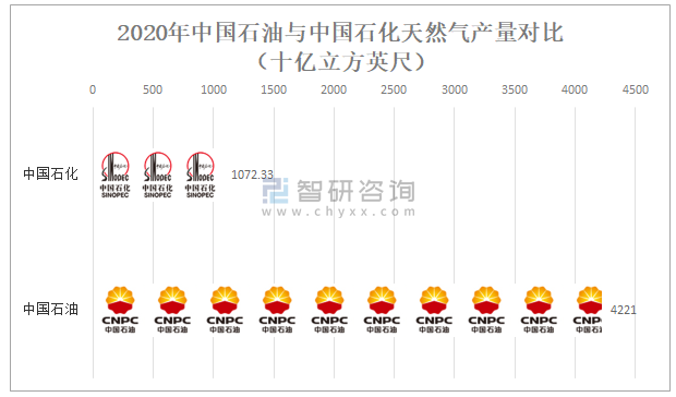 2020年中國石油與中國石化天然氣產量對比(十億立方英尺)