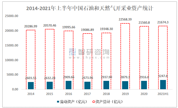 智研咨詢發布的《2021-2027年中國石油和天然氣開采產業競爭現狀及投資方向研究報告》數據顯示:雖然中國石油和天然氣開采業企業數量在增加,但總資產卻小幅減少,2020年中國石油和天然氣開采業資產為21560.8億元,較2019年減少了1007.59億元,同比減少4.5%,2021年上半年較2020年年底小幅增長,2021年上半年中國石油和天然氣開采業資產為21674.3億元,較2020年增加了113.50億元,其中流動資產為3247.6億元。