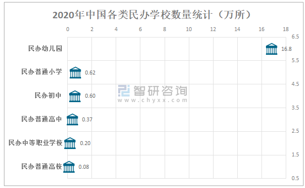 其中,2020年中國共有民辦幼兒園16.8萬所;共有民辦普通小學0.62萬所;共有民辦初中0.60萬所;共有民辦普通高中0.37萬所;共有民辦中等職業學校0.20萬所;共有民辦普通高校0.08萬所。