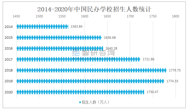 從招生人數來看,自2019年起中國民辦學校招生人數開始下滑,2020年中國民辦學校招生人數為1730.47萬人,較2019年減少了43.86萬人,同比減少2.5%。