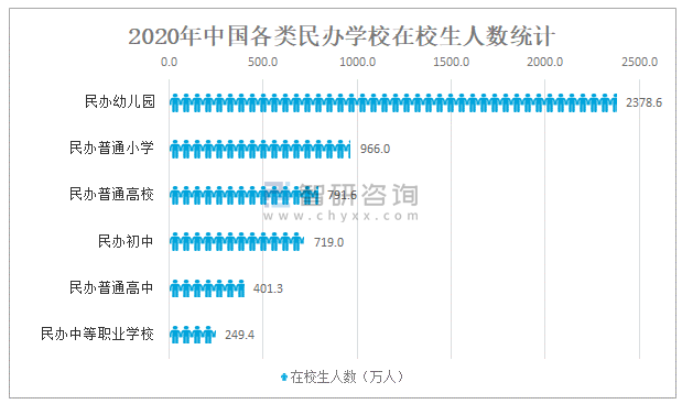 其中,2020年中國民辦幼兒園在校生人數為2378.6萬人;民辦普通小學在校生人數為966.0萬人;民辦普通高校在校生人數為791.6萬人;民辦初中在校生人數為719.0萬人;民辦普通高中在校生人數為401.3萬人;民辦中等職業學校在校生人數為249.4萬人。
