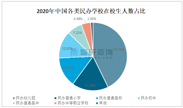 2020年中國民辦幼兒園在校生人數占民辦學校在校生總人數的42.75%,占比最大;民辦普通小學在校生人數占民辦學校在校生總人數的17.36%;民辦普通高校在校生人數占民辦學校在校生總人數的14.23%;民辦初中在校生人數占民辦學校在校生總人數的12.92%;民辦普通高中在校生人數占民辦學校在校生總人數的7.21%;民辦中等職業學校在校生人數占民辦學校在校生總人數的4.48%。