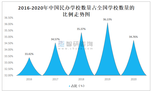 智研咨詢發布的《2021-2027年中國民辦教育產業發展動態及投資戰略規劃報告》數據顯示:近年來中國民辦學校數量占全國學校數量的比例逐年攀升,2019年中國民辦學校數量占全國學校數量的36.13%,較2018年增長了0.76%,2020年較2019年有所下滑,2020年中國民辦學校數量占全國學校數量的34.76%,較2019年減少了1.36%。