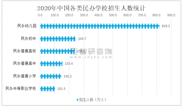 其中,2020年中國民辦幼兒園招生人數為819.3萬人;民辦初中招生人數為243.7萬人;民辦普通高校招生人數為236.2萬人;民辦普通高中招生人數為153.4萬人;民辦普通小學招生人數為145.2萬人;民辦中等職業學校招生人數為101.5萬人。