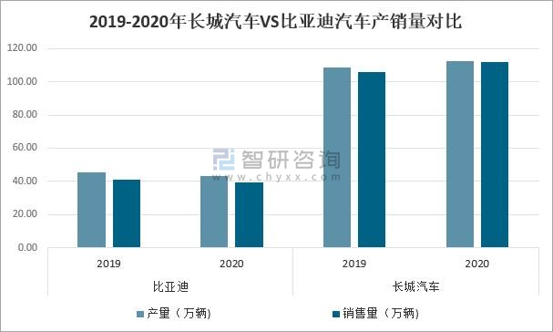 2019-2020年長城汽車VS比亞迪汽車產銷量對比