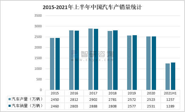 2015-2021年上半年中國汽車產銷量統計