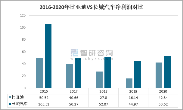 2016-2020年比亞迪VS長城汽車凈利潤對比