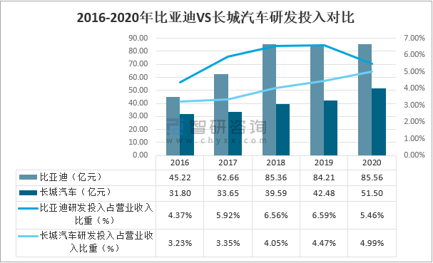 從研發投入來看,兩家公司歷來重視新產品和新技術的開發和創新工作,將新產品研發作為公司保持核心競爭力的重要保證;2020年,比亞迪研發投入85.56億元,占營業收入的5.46%;長城汽車研發投入54.5億元,占營業收入的4.99%。