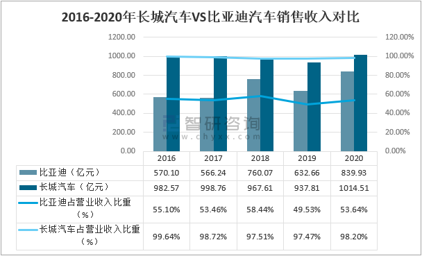2016-2020年長城汽車VS比亞迪汽車銷售收入對比