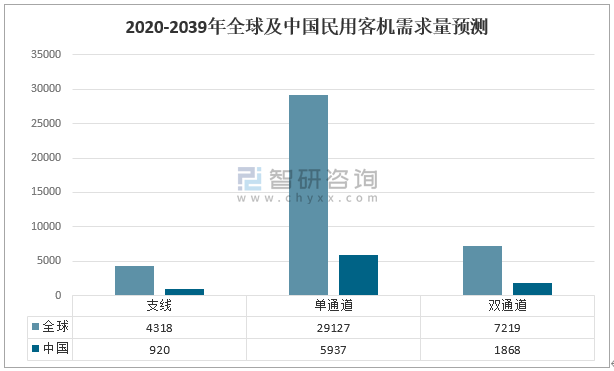 全球航空行業景氣度持續上升,航空客運量持續走高,各國對飛機的需求量保持持續增長。未來20年,全球民用客機預計將有40664架新機交付,中國民航飛機交貨量將達到8725架;預測到2039年中國機隊規模將達到9641架,未來二十年,中國航空市場將接收50座以上客機8725架。
