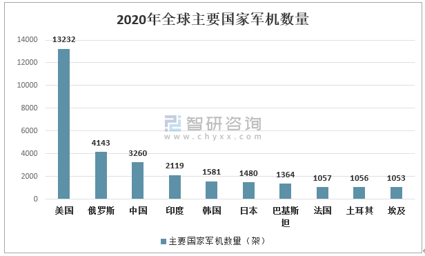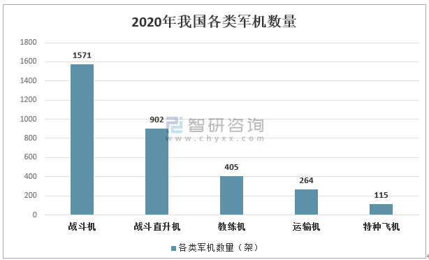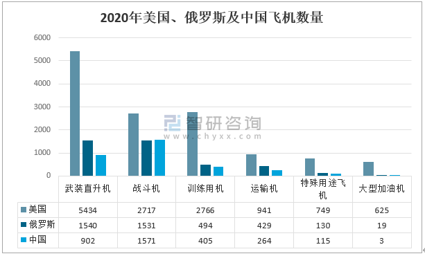 按飛機類型分,美國擁有軍用飛機13232架,其中武裝直升機5434架,訓練用機2766架,戰斗機2717架;俄羅斯擁有軍用飛機4143架,其中武裝直升機1540架,戰斗機1531架,訓練用機494架;中國擁有軍用飛機3260架,其中戰斗機1571架,武裝直升機902架,訓練用機405架。