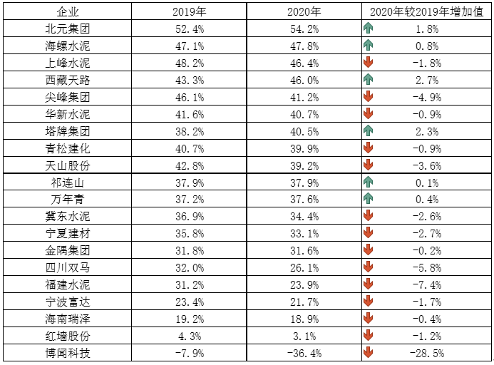 2019-2020年中國重點水泥企業(yè)水泥業(yè)務毛利率
