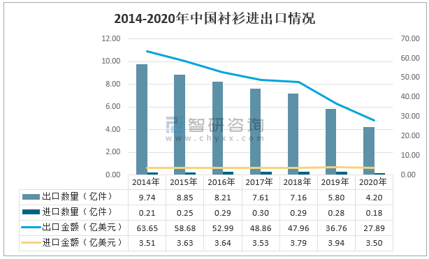 中國是服裝出口大國,襯衫為服裝重要品種之一,近年來,中國襯衫出口數量不斷下降,由2014年的9.74億件下降至2020年的4.20億件,出口金額由63.65億美元下降至2020年的27.89億元。出口數量及金額則較為穩定,2020年中國襯衫進口數量為0.18億件,進口金額為3.50億美元。
