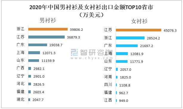 浙江省、江蘇省、廣東省是中國襯衫產量前三地區,也中國襯衫出口大省;2020年浙江省男襯衫出口金額居全國首位,出口金額為39806.2萬美元;江蘇省女襯衫出口金額為全國第一,出口金額為45076.3萬美元。