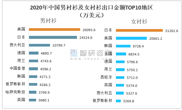 2020年中國男襯衫出口金額TOP3地區分別為美國、日本、澳大利亞,出口金額依次為26093.6萬美元、24524.6萬美元、10799.7萬美元;女襯衫出口金額TOP3分別為日本、美國、韓國,出口金額依次為31262.6萬美元、20661.2萬美元、9728.4萬美元。