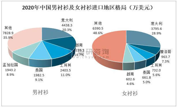 從進口金額來看,意大利為中國襯衫最大的進口地,2020年中國從意大利進口男襯衫4438.3萬美元,占總進口金額的20.3%;從意大利進口女襯衫3795.6萬美元,占總進口金額的28.9%。