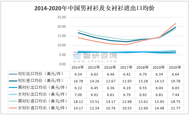 2014-2020年中國男襯衫及女襯衫進出口均價