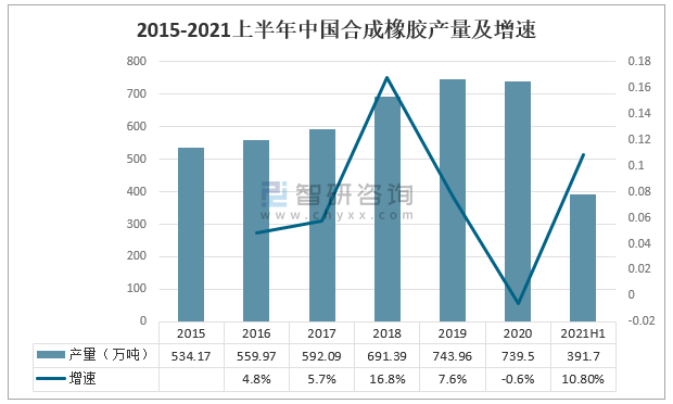 智研咨詢發布的《2021-2027年中國合成橡膠產業發展動態及投資趨勢預測報告》數據顯示:人工合成的高彈性聚合物,也稱合成彈性體。產量僅低于合成樹脂(或塑料)、合成纖維。其性能因單體不同而異,少數品種的性能與天然橡膠相似。橡膠是制造飛機、軍艦、汽車、拖拉機、收割機、水利排灌機械、醫療器械等所必需的材料。2021上半年中國合成橡膠產量為391.7萬噸,同比增長10.8%。