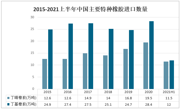 特種橡膠指具有特殊性能和特殊用途能適應苛刻條件下使用的合成橡膠。如耐300℃高溫,耐強侵蝕,耐臭氧、光、天候、輻射和耐油的氟橡膠;耐-100℃低溫和260℃高溫,對溫度依賴性小、具有低黏流活化能和生理惰性的硅橡膠;耐熱、耐溶劑、耐油,電絕緣性好的丙烯酸酯橡膠。2021上半年中國丁晴橡膠進口數量為11.5萬噸;中國丁基橡膠進口數量為12萬噸。