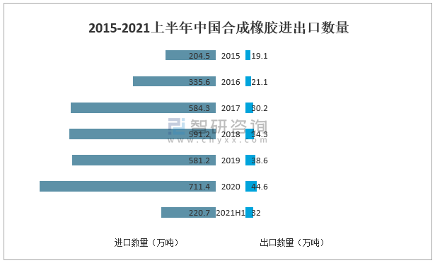 近年來,中國合成橡膠行業逐步呈現出產能集中度高、產品性能要求高、環保要求高、下游用戶聚集度高等特點,中國合成橡膠在消費量、產能、進口量和下游輪胎產量方面均居世界第一。2021上半年中國合成橡膠進口數量為220.7萬噸;出口數量為32噸。