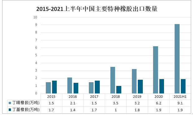 據中國海關數據,2021上半年中國丁晴橡膠出口數量為9.1萬噸;中國丁基橡膠出口數量為1.9萬噸。