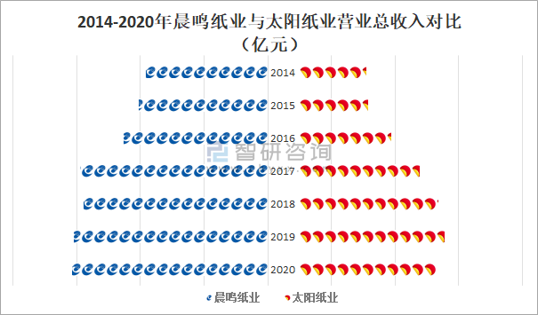 2014-2020年晨鳴紙業(yè)與太陽紙業(yè)營業(yè)總收入對比(億元)