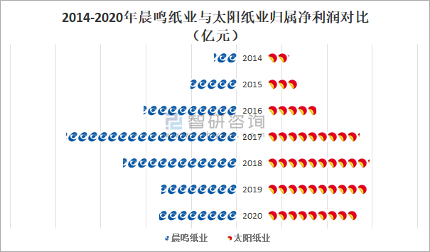 2014-2020年晨鳴紙業(yè)與太陽紙業(yè)歸屬凈利潤對比(億元)