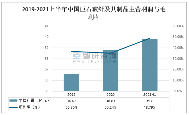 2019-2021上半年中國巨石玻纖及其制品主營利潤與毛利率